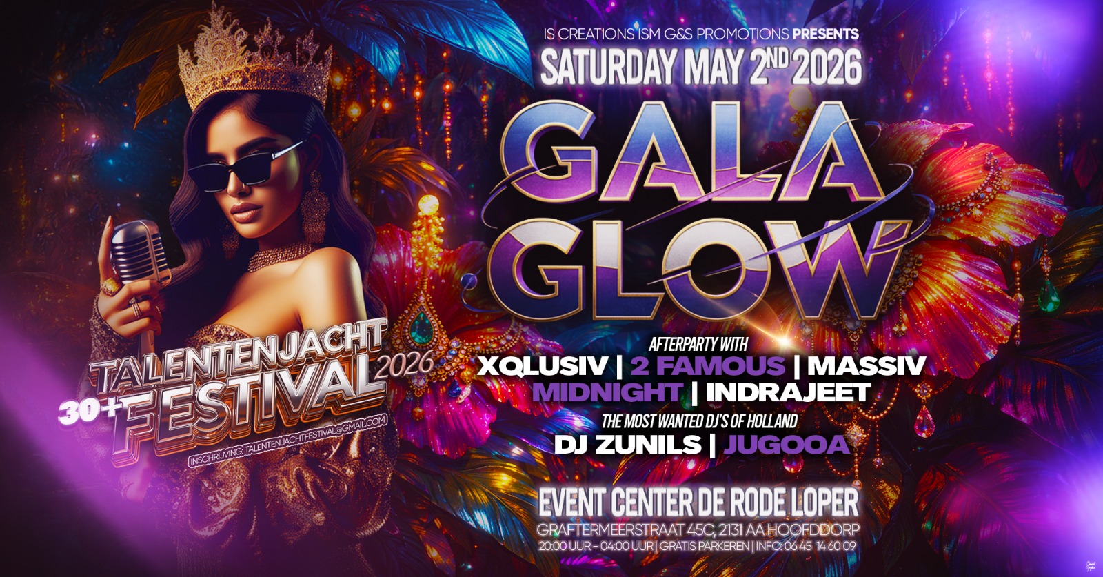 Op zaterdag 2 mei 2026 vindt in Event Center De Rode Loper in Hoofddorp de 19e editie van het Gala Glow Talentenjacht Festival plaats. Dit populaire evenement staat al jaren bekend als een avond vol entertainment, talent en feestelijke sfeer. Bezoekers kunnen zich verheugen op een spectaculaire talentenjacht en een energieke afterparty met verschillende DJ’s. Het festival wordt georganiseerd door…